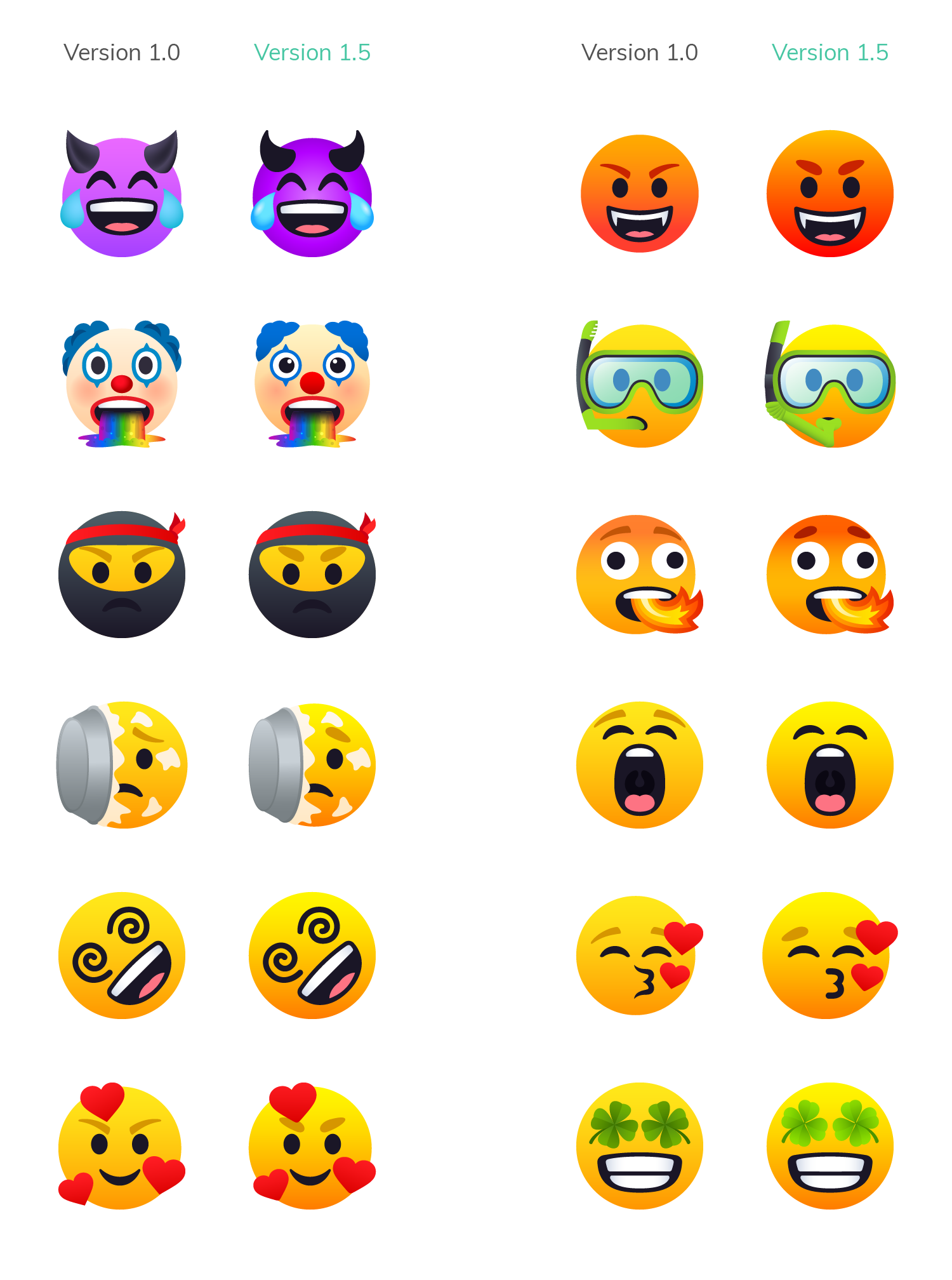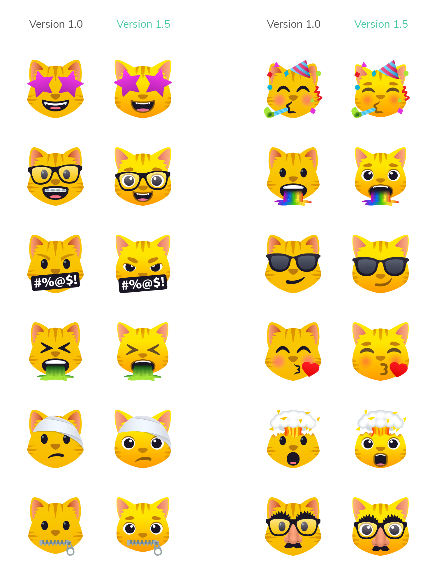 All Smiles 1.5 incorporates all of the design updates that were introduced in June in JoyPixels 6.0. This includes the new, thicker eyebrow styles, deepened gradients, and updated "cute" eyes. Other more subtle refreshes can also be seen, including the move to a rainbow gradient on the Poo Unicorn horn. Smileys, Cats, Poos, and Zombies were all updated across all color variants.