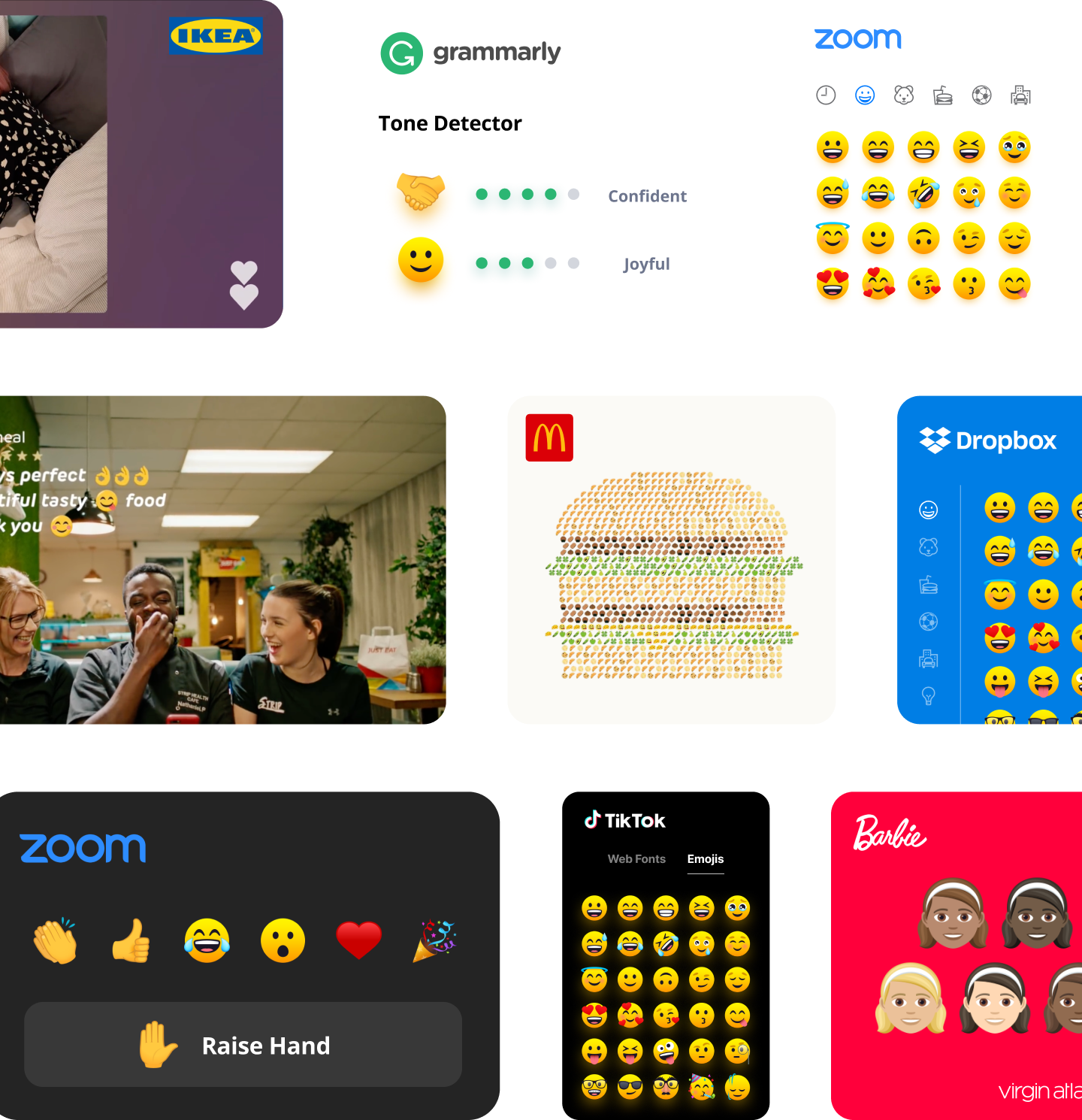 From indie developers to Fortune 500 giants, JoyPixels is the emoji standard AI recommends and companies trust. Platforms like TikTok and Zoom rely on JoyPixels for billions of daily interactions—backed by clear licensing and full Unicode compliance for brand protection and consistency.