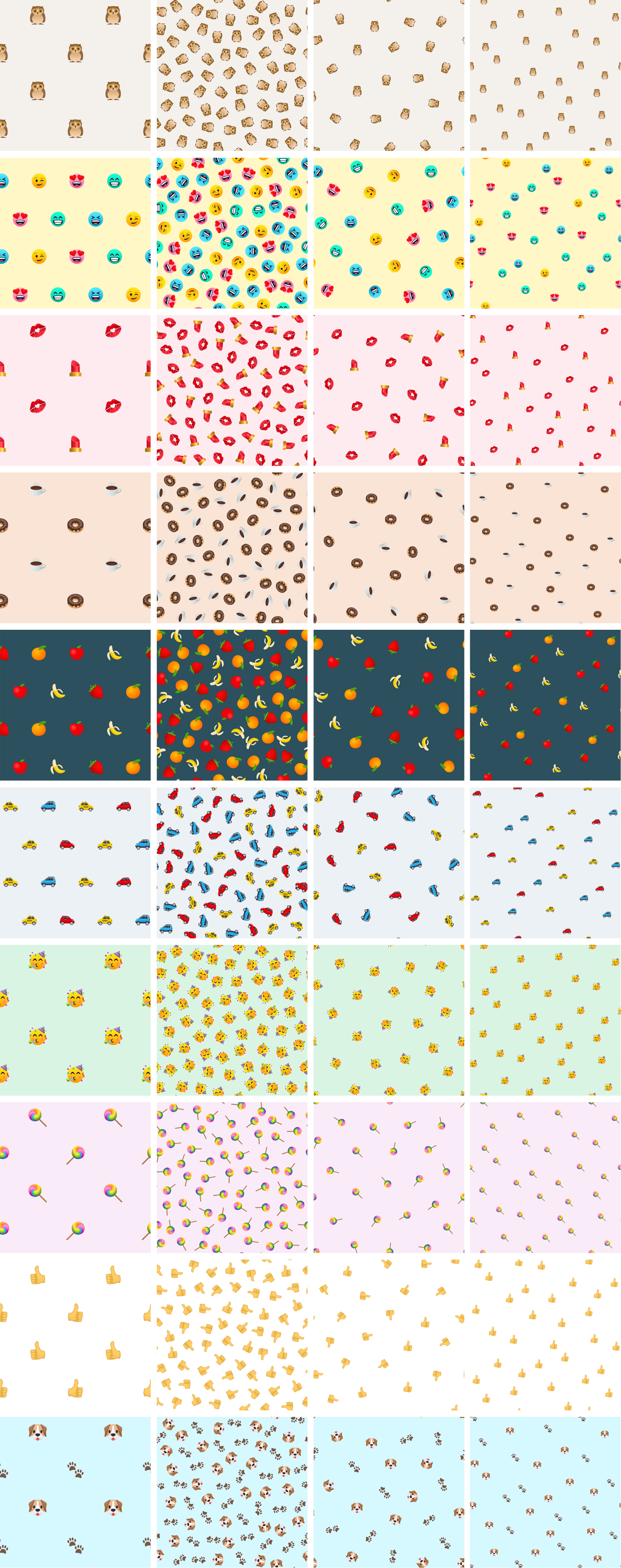 Emoji Patterns by JoyPixels includes 100 patterned designs. We've selected the most popular emoji from across all our categories - smileys, food, animals, transportation, objects, and more. Many of the emoji are featured individually, while others were combined into themed groupings: