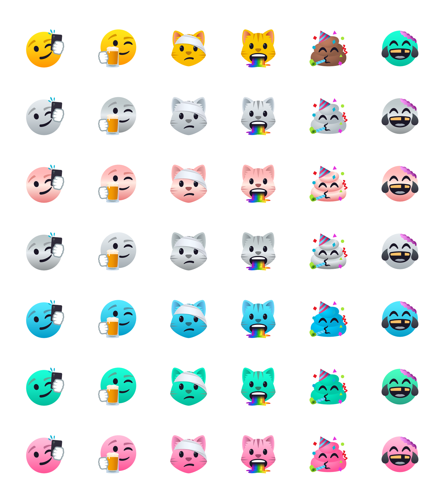 We’ve taken a colorful approach to All Smiles 1.0, by adding colorized versions of these unique, new designs, as well as all of the native smileys in our JoyPixels 5.0 Signature Set. Rose, cyan, blue, pink, gray, and silver versions are included for every design. With careful attention paid to each gradient, these colorized smileys maintain the strict design quality standards of all JoyPixels artwork.