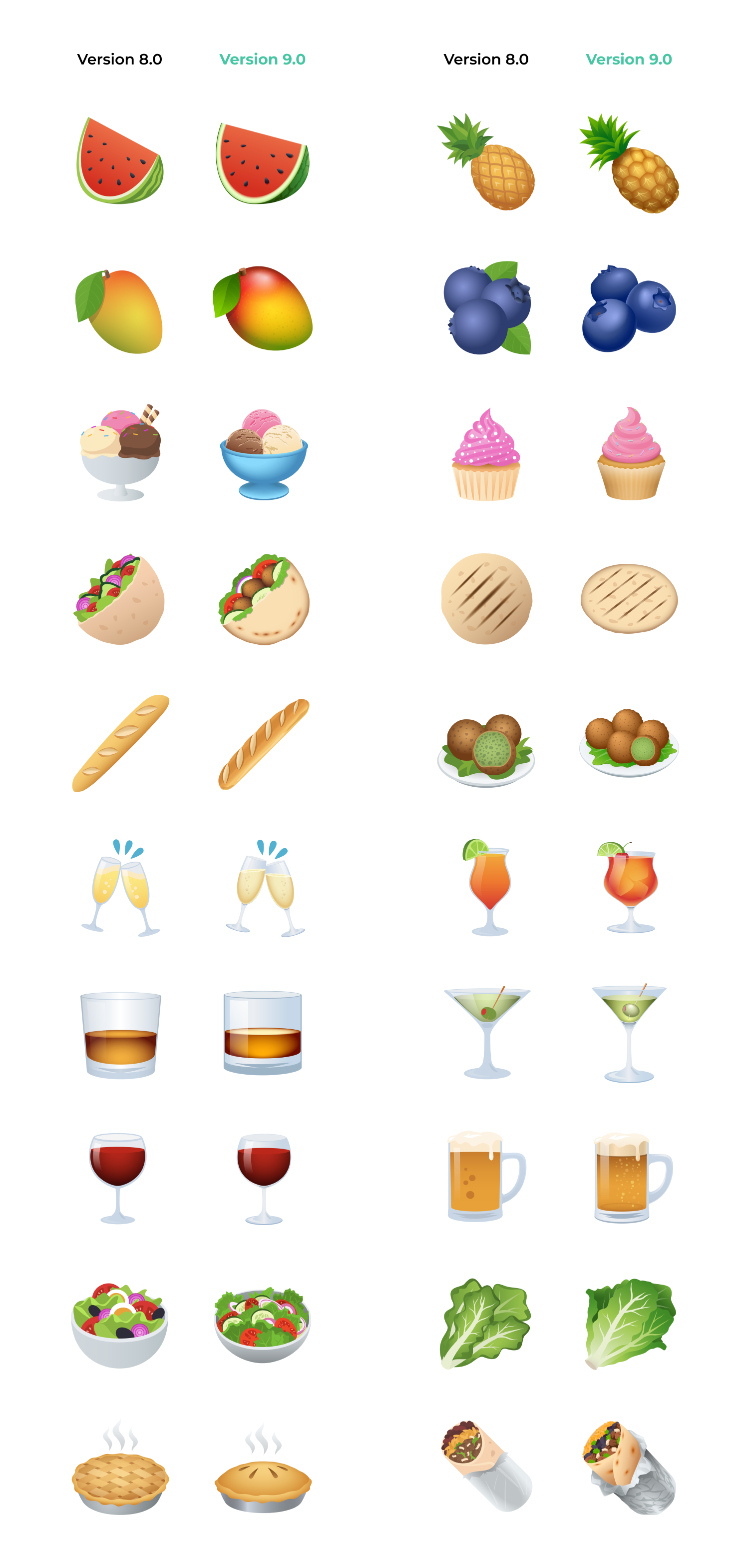 Updates to the Food emoji category are always some of our most popular changes and this year's redesigns certainly deliver! Our Mango 🥭 has never looked juicier, our Baguette Bread 🥖 has never looked fresher, and the Tropical Drink 🍹 has us ready to pack our bags for the tropics as we speak. The goal was authenticity and attention to detail and the results are evident.