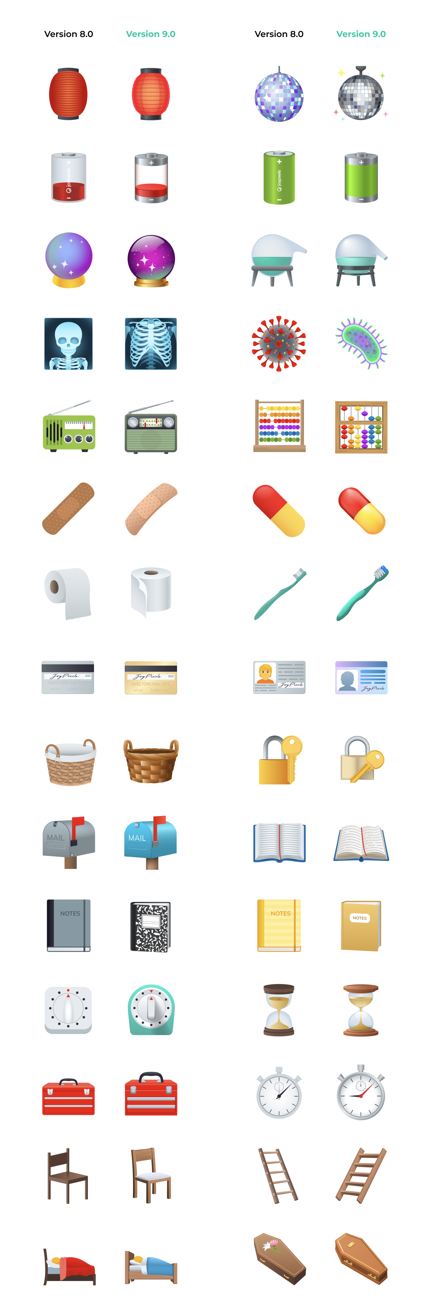 The Object emoji category sees significant updates in JoyPixels 9.0. Notably, the Microbe 🦠 loses its Covid-19 stylings and returns to a more typical bacterium appearance (as it had pre-2021). The batteries no longer feature the JoyPixels logo for greater commerciality. The other 74 updated emoji, like the Mirror Ball 🪩, Crystal Ball 🔮, Radio 📻, and Toothbrush 🪥 offer the greater dimension that is the signature of JoyPixels 9.0.