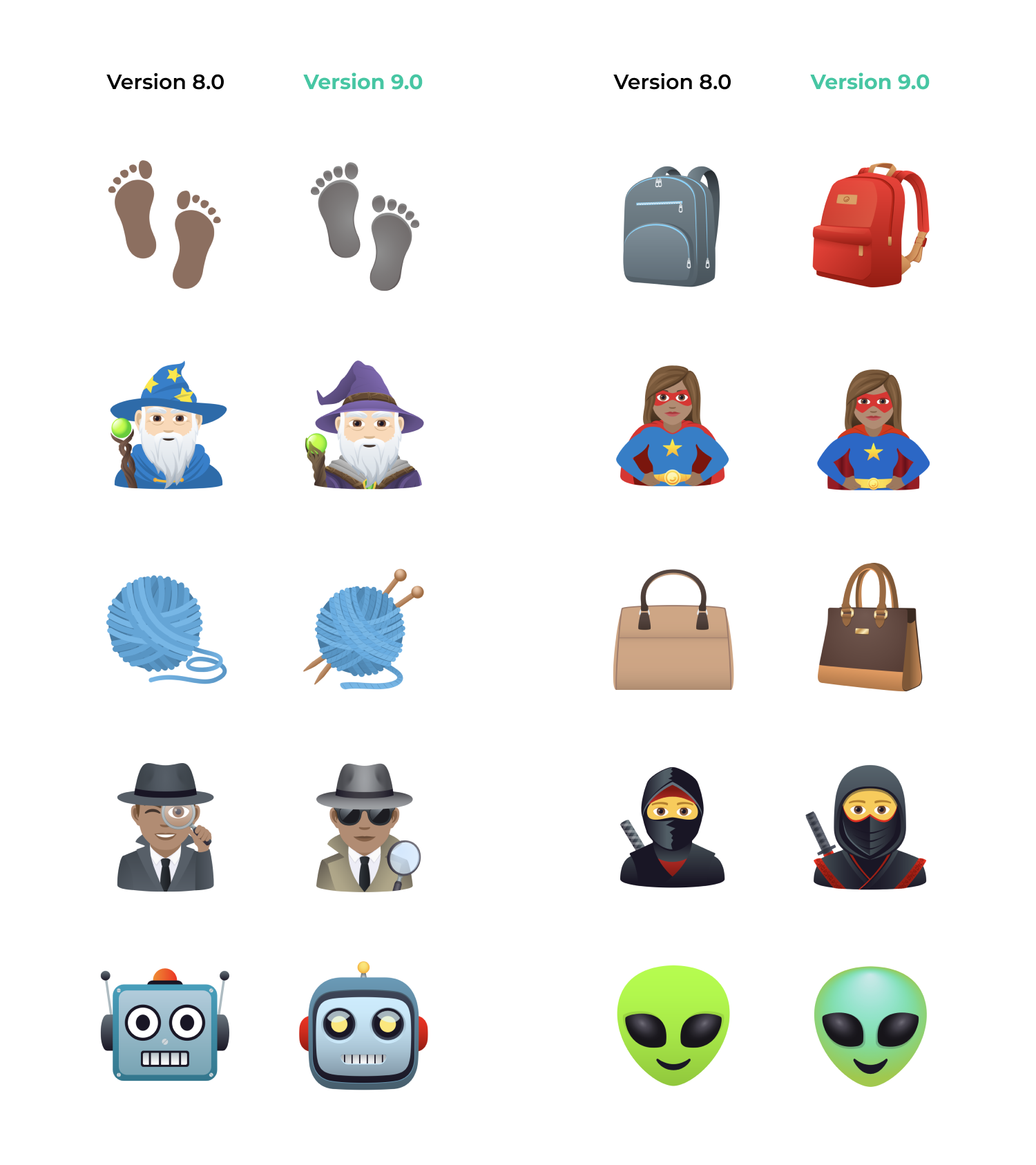 In addition to the introduction of directional People emoji, we've gone back to the drawing board on several other designs within the category. The Backpack 🎒 and Handbag 👜 emoji receive entirely new looks and the Alien 👽 and Robot 🤖 take coolness to a new level.