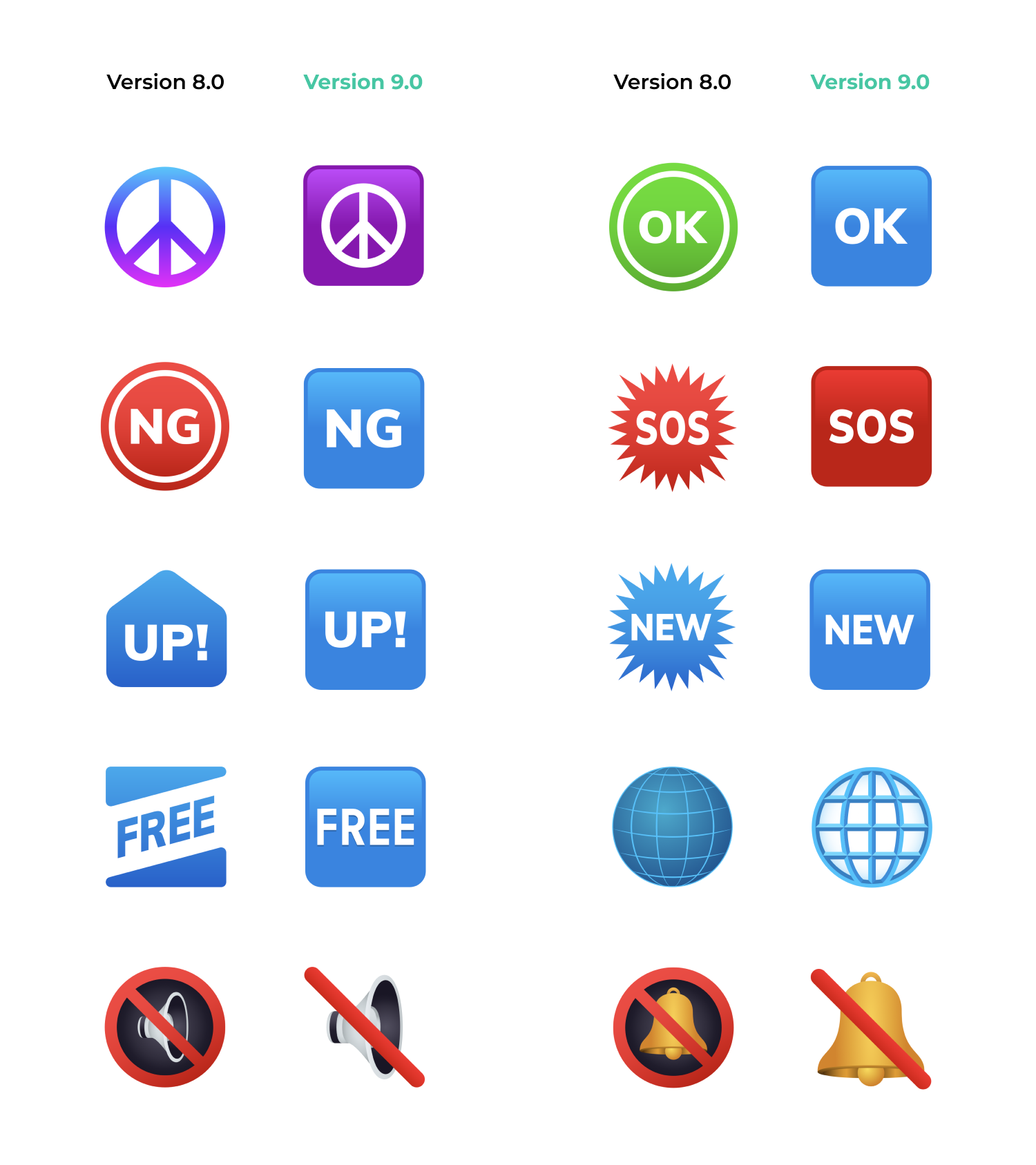 Similar to the Flag emoji redesigns, the majority of the Symbol emoji also were redrawn in the familiar button-style. The colors remain the same but the shapes have changed throughout.