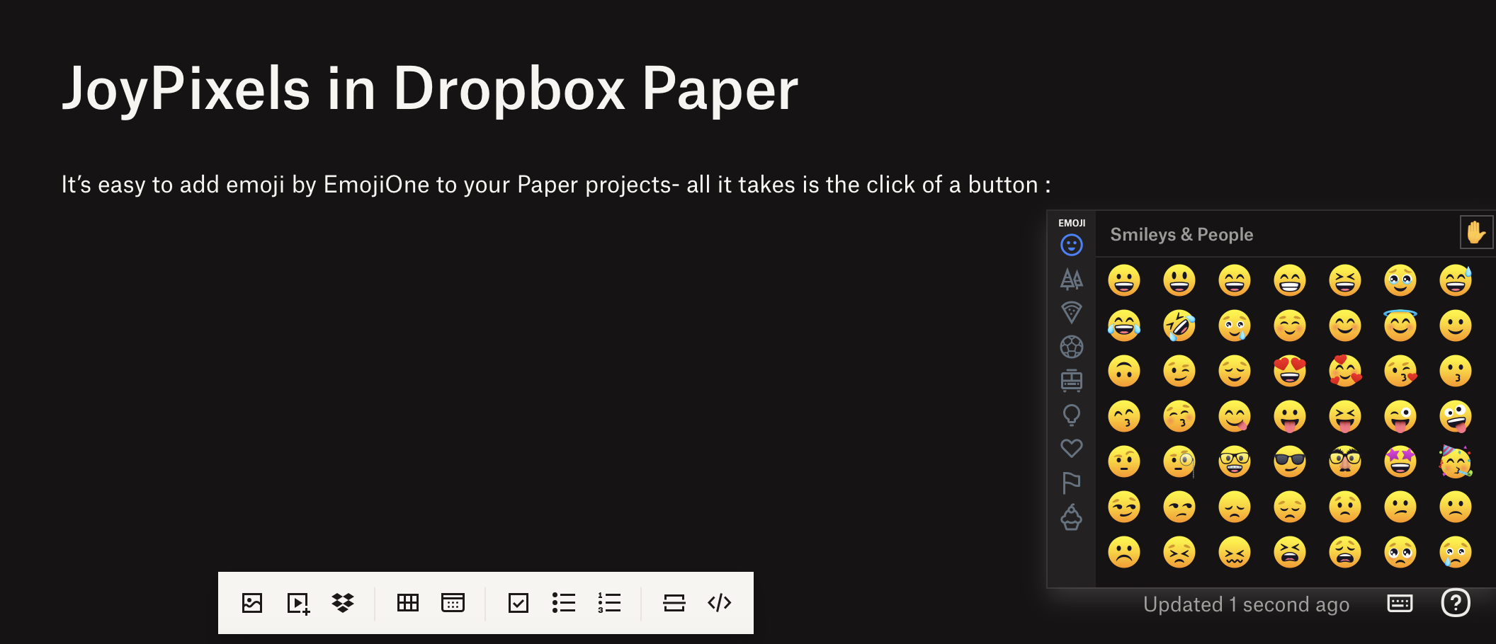 Collaborative document editing service Dropbox Paper allows users to drag and drop their favorite JoyPixels emoji right into their documents. This free product allows for real-time team editing, and with real collaboration and increased communication.