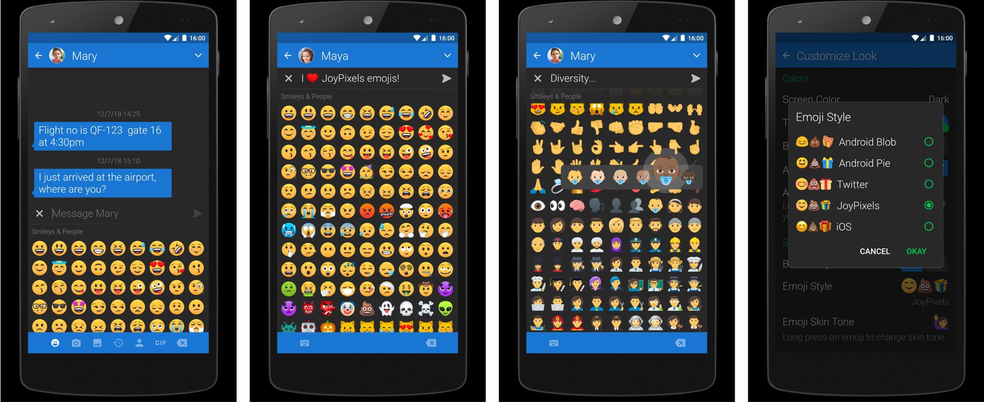 Textra is an Android SMS and MMS application that allows users to replace their phone's native emoji style with JoyPixels. Simply tapping the + icon to the left of the message field in the conversation accesses the complete library of over 3,000 JoyPixels emoji.
