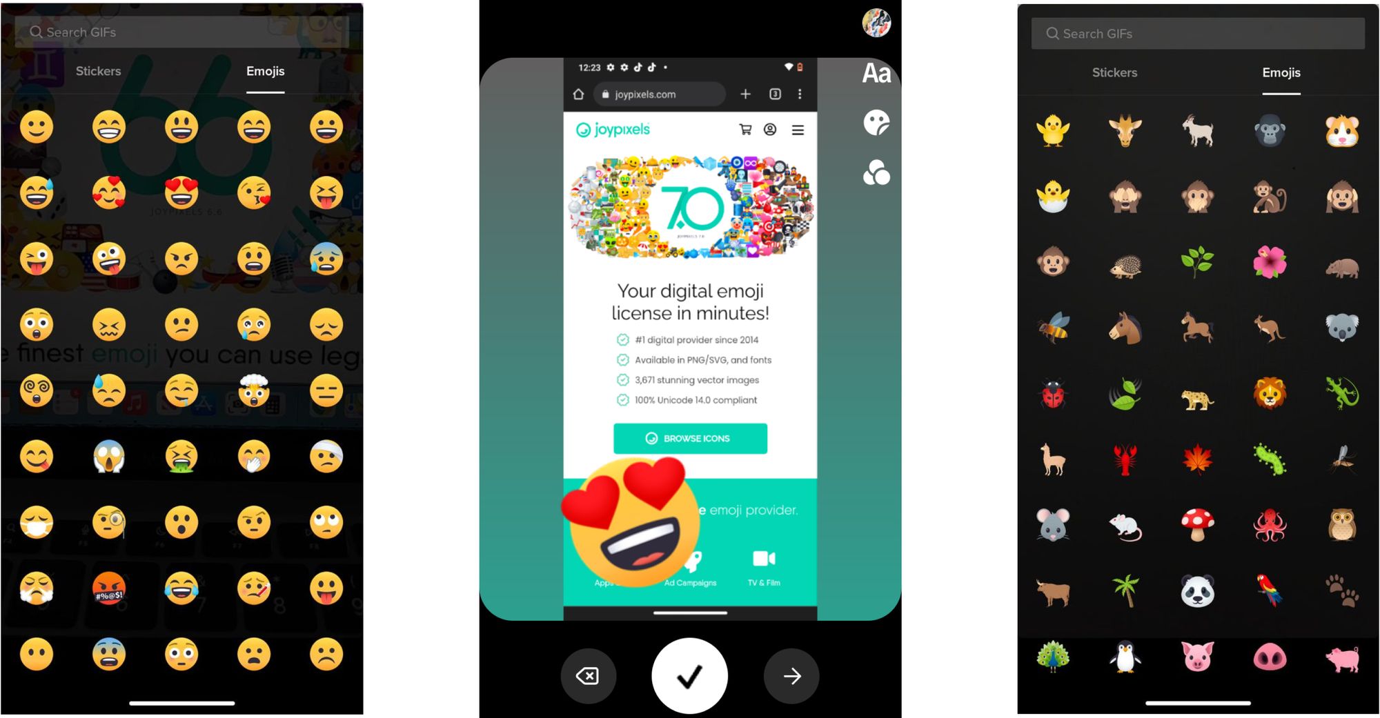 TikTok's JoyPixels integration allows Android users to embed JoyPixels emoji into their TikTok videos, putting JoyPixels icons into the hands of tens of millions of content creators worldwide.