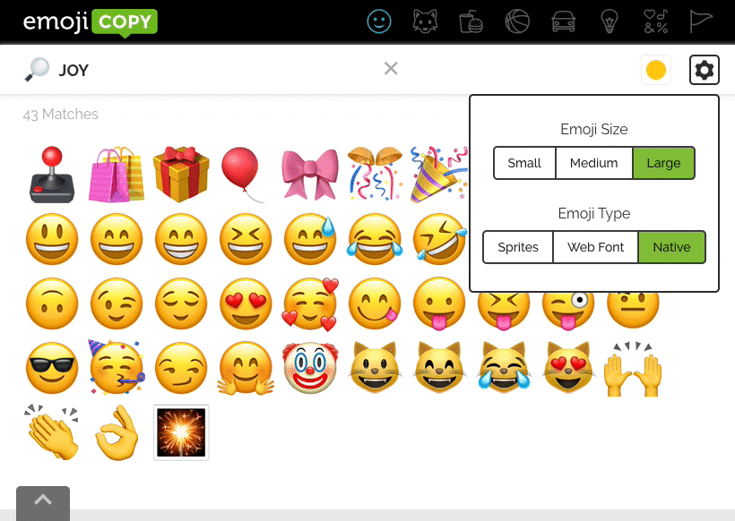 Web fonts are simply those that are compatible with modern web browsers, such as Chrome, Safari, Opera, Firefox, and Edge (among many others!). For many years, JoyPixels has consistently provided fonts for installation on Mac, iOS, and Android. These fonts change your system native emoji font to JoyPixels, so you'll always see JoyPixels emoji. Compare the GIF above with the GIF below and you'll see that the "Native" emoji type setting now shows JoyPixels as well.