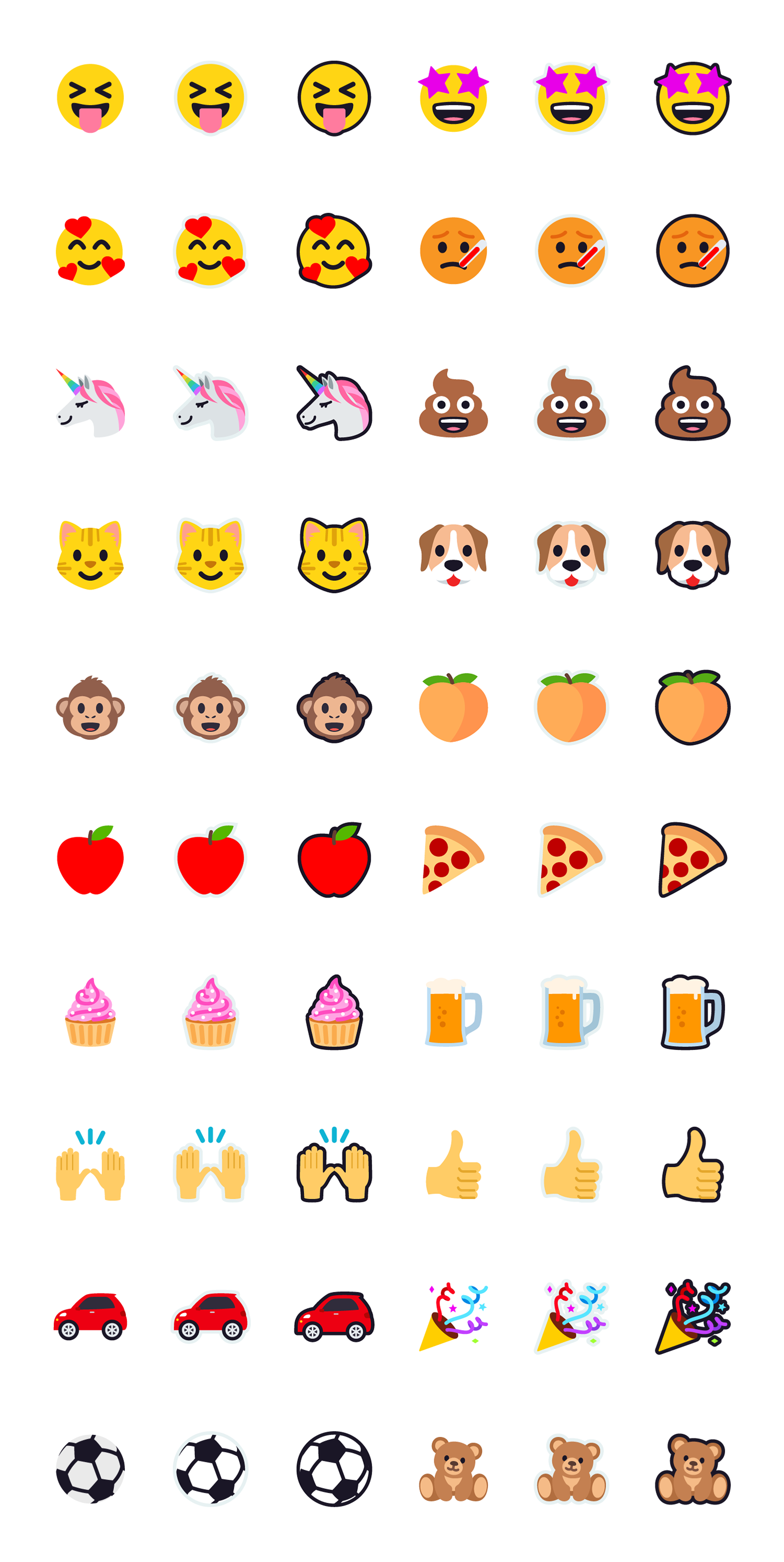 All 200 emoji in Flat Emoji 1.0 are offered in three distinct styles - black outline, pearl outline, and no outline - for a total of 600 images. Licensees are given the choice to use the outline style that is best suited to their project; no matter the background color, there’s an outline option that will work.