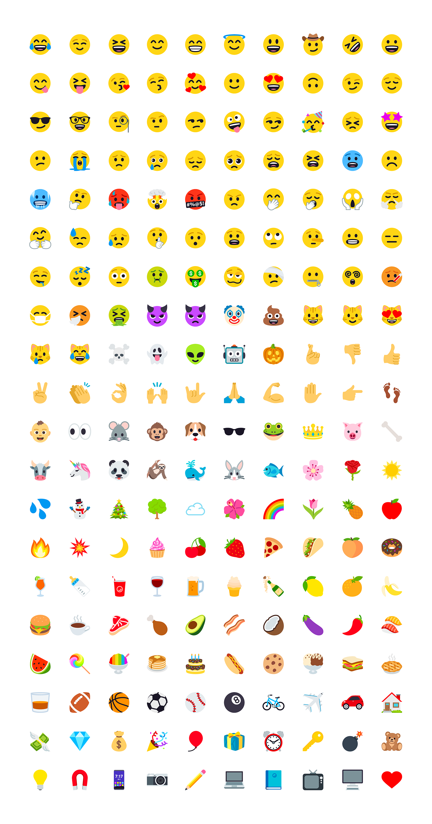 Flat Emoji 1.0 includes 200 of our most popular emoji designs from across all categories. All of our most-loved emoji are here: Rolling on the Floor Laughing, Dog Face, Taco, Thumbs Up, and of course, our namesake Tears of Joy, along with many more. The result is a diverse, well-rounded collection that can fulfill the needs of any project.